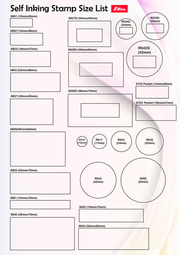 Shiny Self Inking Holder Description Shiny self inking stamps comes with various sizes and color. Check out the size chart for more information. Price List Size Chart Request an Offer Whatsapp
